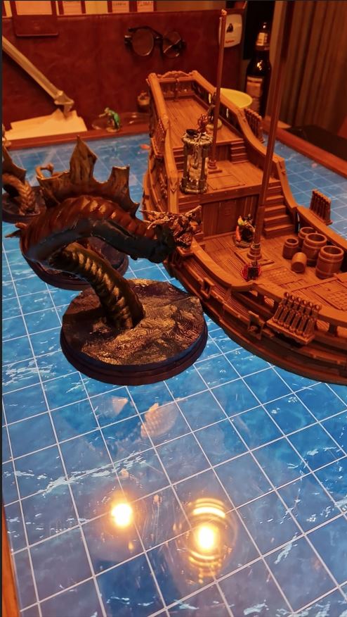 Wulfgar schiet een pijl en rent naar Corryn om te helpen met het kanon te laden. Nokk schiet nogmaals een pijl en mist. Flaw cast Storm Sphere.Slang valt Dradimir aam en treft met behoorlijke damage.En dradimir gebruikt zijn daily breath attack. In een poging om het schip van de slang weg te sturen, draait Nokk het schip, maar de slang draitmee en komt weer langszij. Corryn schiet met het kanon op de slang en raakt hem lichtjes.. De kapiteinn vlucht weg. Wulfgar herlaad het kanon. Nokk draait het schip weer terug en schiet weer een pijl. Mis! (klap klap)