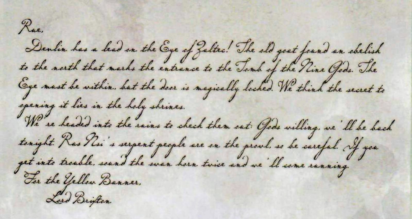 Als we in de globale richting van de brul kijken zien we eens tuk dichterbij nog een tempel. Iedereen besluit in stealth te gaan, behalve Drad. Wulfgar denk dat hij erg stealthy is, maar niets is minder waar đ Dichterbij het gebouw blijkt het geen tempel te zijn, maar er wordt wel een beschimmeld stuk perkament gevonden op een campsite van onbekenden. Hier blijkt na het onderzocht te hebben een groep avonturiers geweest te zijn die eerder door Sindra er op uit gestuurd zijn om de death curse te onderzoeken. Dit ontdekken we aan de hand van de yellow banner die er, aardig gehavend, nog wapperde.