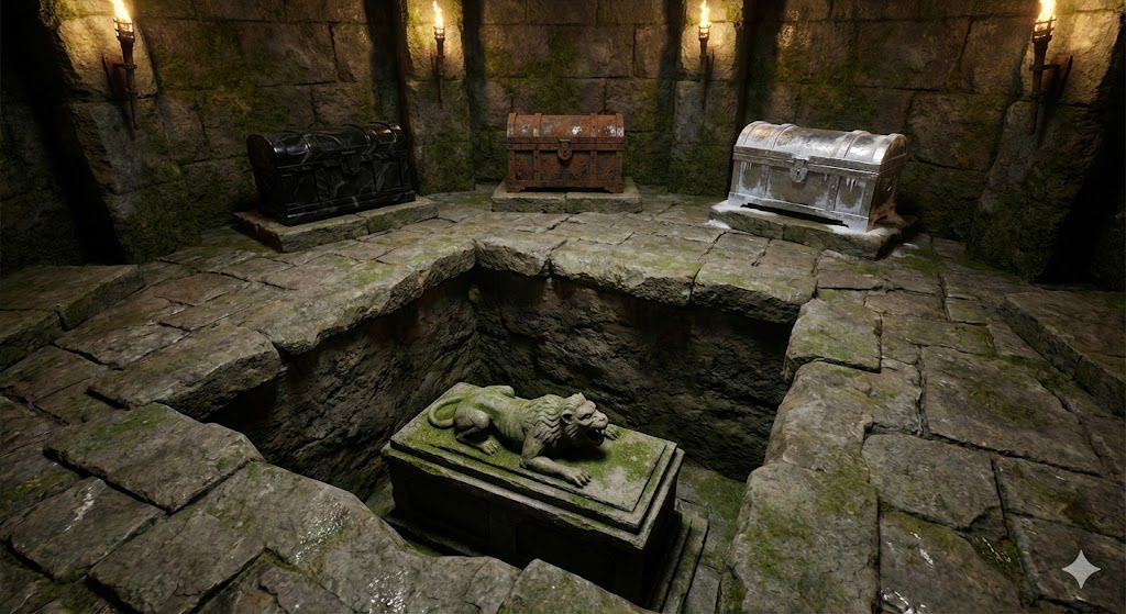De rest van de groep betreed ook de ruimte. Ze doorzoeken de ruimte. Ze vinden niets meer aan de sacrofaag. Aan de kisten ziet Nokk verder niets bijzonders.