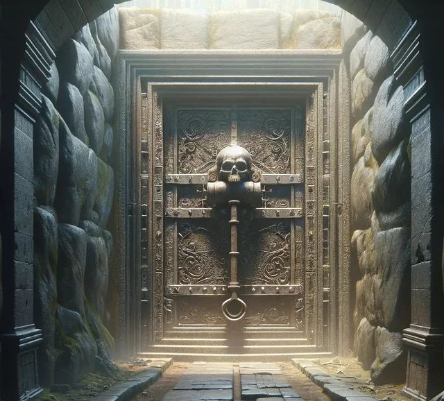 In de gang waar hij naar op weg was ziet hij een gigantische schedel. In de oogkassen vlammen. Onder in de mond is een doorgang.